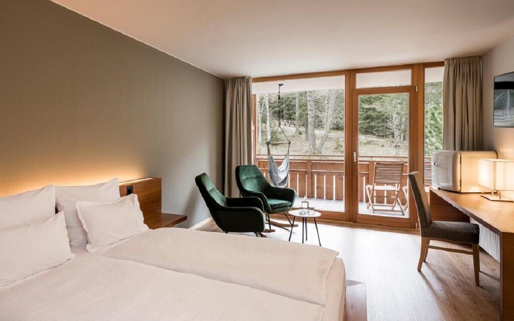 Il Forestis Dolomites a Plancios, a 20 km da Bressanone, offre accesso diretto alle piste, vista sulle Dolomiti, centro benessere e ristorante. Le suite, eleganti e in legno, hanno salotto, balcone e bagno completo. Include colazione bio, cena, sauna, idromassaggio e giardino panoramico. Deposito sci e lezioni disponibili.